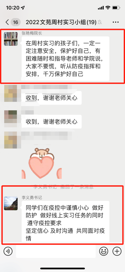 在淄博市的此轮新冠疫情中,周村区和桓台县尤为严重。疫情发生后,公司迅速召开会议研究对策办法,为各地实习支教员工建立通讯群,公司党委书记李义勇、经理张艳梅加入群聊,在群中关心员工,他们叮嘱员工“有问题第一时间联系公司和指导老师,注意安全,保护自己”。公司第一时间为身处疫情较为严重的周村区和桓台县实习员工联系物资保障,保证员工储备充足食品、生活用品和防疫用品。这一暖心举动让员工感动不已。有一位员工动情地说:“看到书记经理在群里关心我们,嘱咐我们吃饱穿暖的时候,就像看到了自己的爸爸妈妈。是啊,我们不是孤立无援的,我们的背后有同学、有老师,更有一整个温暖的文院大家庭。这次真正明白了什么是‘温暖文苑,与爱同行’。”