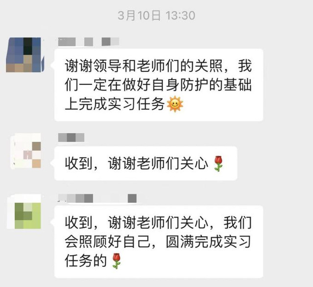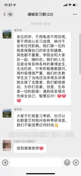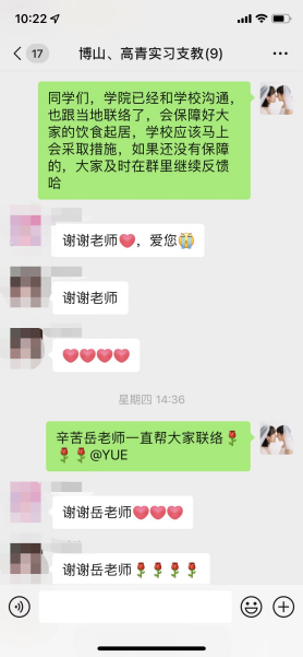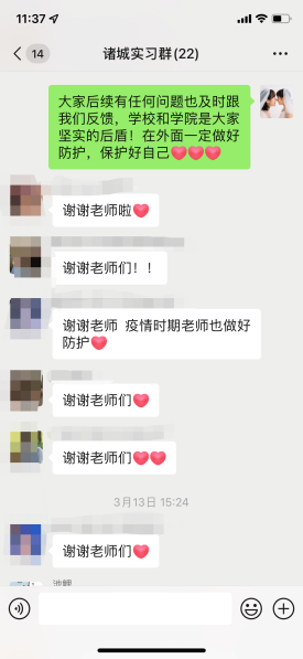 实习支教员工的情况也牵动着指导老师和辅导员的心。自疫情开始,岳庆云、柏秀叶、张健、沈传河等指导老师每天都会联系在外实习的员工,并要求员工在群内安全打卡。收到每个员工都回复的“安全”,指导老师才能安心放心。此外,他们也会每天都和在外地实习的员工进行线上交流,有时是一通简单的电话,知道他们平安就好;有时是一则QQ留言,问问他们的衣食住行;有时则是一次长时间的视频电话,还会在闲聊之余交流一下上课心得和专业知识。