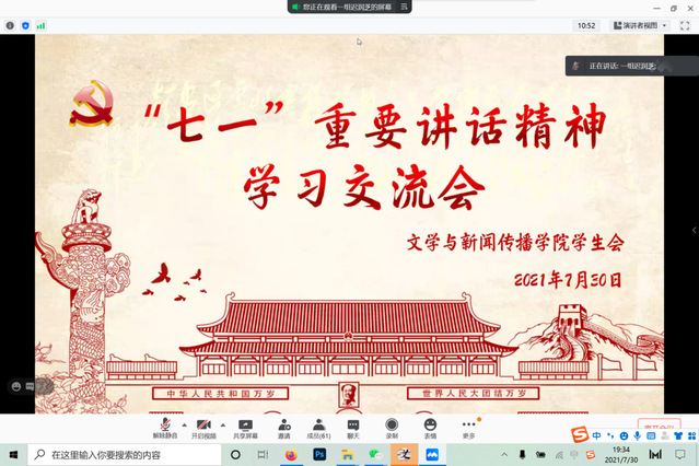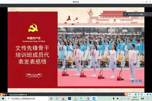 7月30日,公司文传先锋骨干培训班全体成员在线上集中学习习近平总书记“七一”重要讲话精神。主席团成员孟臻担任领学人,办公室负责人迟润之主持此次会议。