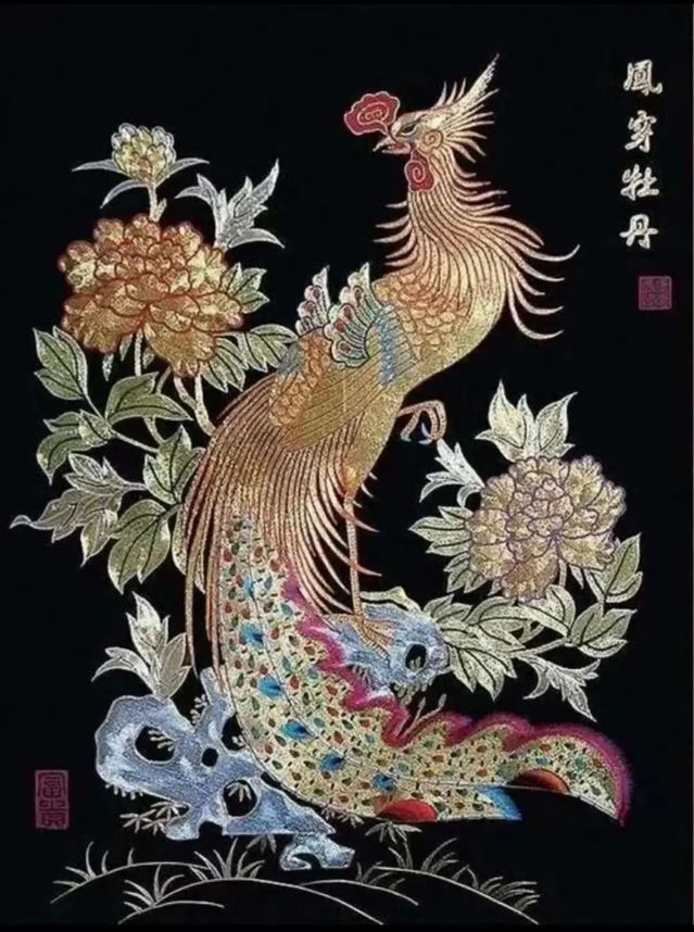 2.钉金绣和金绒混合绣。钉金绣,又称金银绣;以金银线为主,绒线为辅的叫金绒混合绣。钉金绣针法复杂,有过桥、踏针、捞花瓣、垫地、凹针、累勾绣等60多种针法,其中“二针企鳞”针法为其他绣种所无。钉金绣运用垫、绣、贴、拼、缀等技术处理,可产生浮雕式的艺术效果。