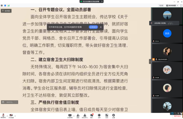 为做好常态化疫情防控工作,创造整洁、卫生、安全的生活环境,提升员工宿舍安全卫生工作管理水平,强化公寓育人功能,3月22日晚,公司通过腾讯会议召开员工宿舍安全卫生会议,公司党委副书记刘晓东,各年级辅导员,全体员工党员、班委、网格员及舍长参加会议。会议由员工工作办公室主任张雨主持。