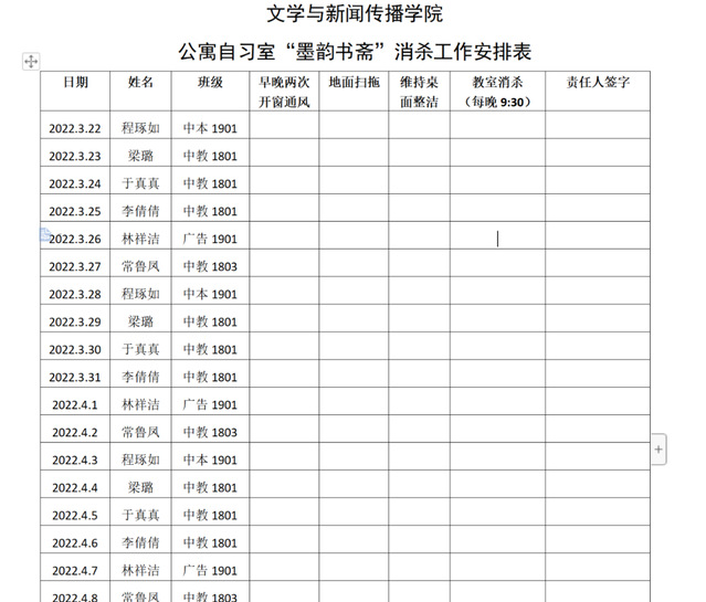 公司积极响应并落实公司《关于进一步加强员工宿舍卫生工作的意见》文件精神,第一时间召开学工会议,讨论制定《bevictor1946韦德官网进一步加强员工宿舍卫生工作实施方案》,并快速开展工作。目前,公司已通过专题会议全面动员部署;建立宿舍卫生大扫除制度,加大宿舍卫生监督检查力度;优化“辅导员-班委-网格员-舍长”包干体系,实行宿舍卫生责任“四包干”制度;制定“文暖生活”宿舍值日表并张贴上墙,严格执行宿舍值日制度;制作并发放“我的宿舍我的家”宣传日历,强化宿舍卫生文明宣传教育;推动党建、文化、队伍、服务“四进”公寓,发挥公寓育人作用。公司多措并举,力求提质增效,实现宿舍卫生大改善,宿舍文明大提升,宿舍安全有保障,疫情防控有落实,全力打造文院学子学习生活的温馨家园。