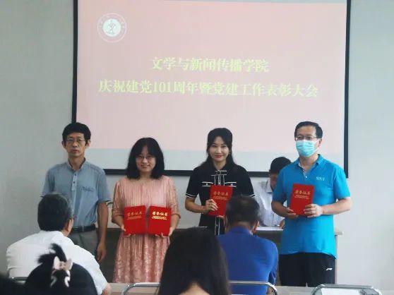 党委青年委员翟羽佳为“学习强国”挑战赛获奖集体代表和个人代表颁奖,党委统战委员吕逸新为优秀党建融创项目负责人、优秀课程思政示范项目负责人和优秀育人名师工作室负责人代表颁奖,党委书记李义勇为“文传先锋”优秀党支部和优秀党员代表颁奖。