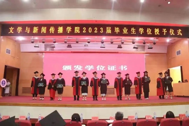 伴随着悠扬的音乐,学位评定委员会成员为毕业生颁发学位证书并拨正流苏,毕业生依次上台领取学位证书,留下珍贵的合影。