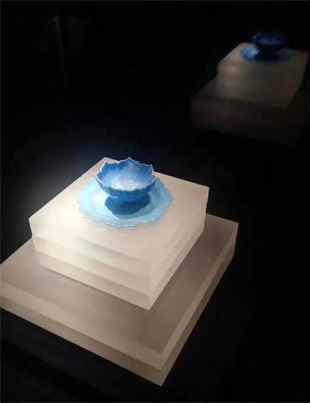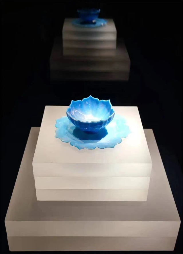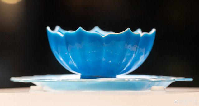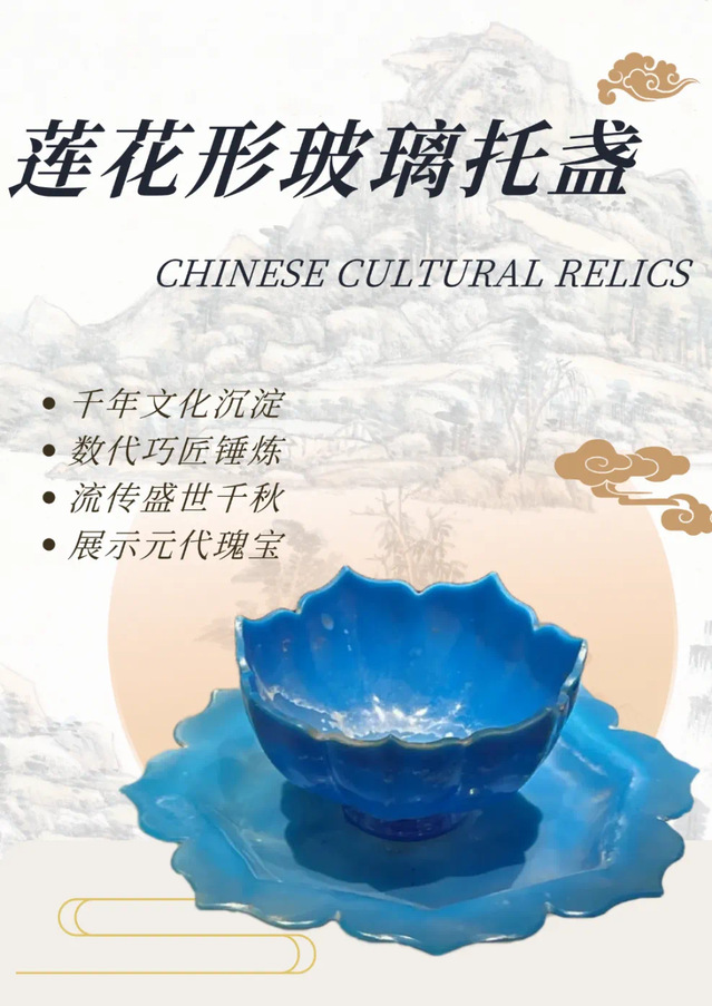 茶托呈八瓣莲花形,茶盏呈七瓣莲花形,由蓝色玻璃制成。从这套玻璃莲花托盏中可以看出元代官办手工业发达。