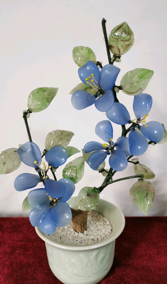 料玉盆景是博山美术琉璃品种之一,用玻璃料制成仿玉石纹采下端带有小孔的花瓣、叶片和枝干,以细金属丝串缀成整枝花木,放入花盆而成,是观赏性的装饰工艺品。