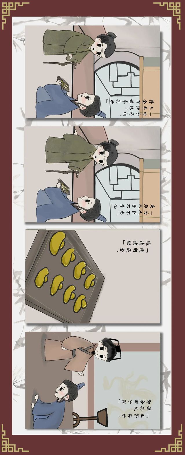 田母一见顿时面露怒容:“你为相三年,俸禄从没有这么多,难道是掠取民财、收受贿赂得来的?”田稷低下了头,以实情相告,田母严肃地说:“我听说士人严于修己、洁身自爱,不取苟得之物;坦荡磊落,不做诈伪之事。不义之事不存于心,不仁之财不入于家。你肩负着国家的重任,就应处处做出表率。而你却接受下属的贿赂, 这是上欺瞒国君,下有负于百姓,实在让我痛心啊!速将金子退回,请朝廷发落吧!”