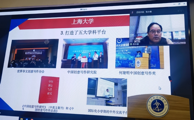 张永禄通过线上方式和大家见面交流,着重介绍了新文科背景下上海大学创意写作教学体系的建设与发展。他从“新文科:创意写作在中国势在必行”、“人民性:中国创意写作的底层逻辑”、“在路上:异彩纷呈的中国创意写作故事”等三个方面展开讲解。他认为,创意写作的诞生本身就带有“新文科”属性,所以创意写作应在新文科建设的纲领和视角内,实现更有作为的交叉融合,达到更高目标。