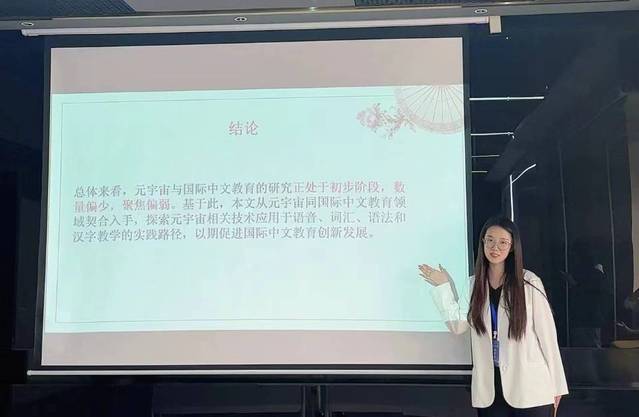 此次会议规模宏大,内容丰富。会议由开幕式、分组讨论、主题发言、专家总结点评、颁奖、研究生代表发言等环节组成。各高校研究生围绕元宇宙与国际中文教育的发展前景展开讨论。邱文蓉的论文题目为“元宇宙视域下国际中文教育创新发展路径研究”,她将元宇宙与国际中文公司产品相契合,探索元宇宙相关技术应用于语音、词汇、语法和汉字教学的实践路径,以期促进国际中文教育实现创新性发展。在分论坛元宇宙技术驱动下中文课程个性化研究论坛上,韩立信以中华文化课程为例,对元宇宙技术驱动下的中文课程进行个性化研究。他指出,元宇宙提供了沉浸式的学习环境、逼真的教学体验场景,这将给国际中文教育专业带来跨越式发展,从而促进中华文化的传承与传播。
