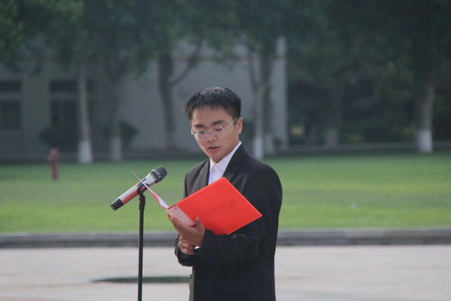 清阳曜灵,和风容与。国旗护卫队迈着整齐划一、铿销有力的步伐护送五星红旗入场。伴随庄严激昂的《义勇军进行曲》响起,全体师生凝望着五星红旗冉冉升起,随风飘扬,向国旗行注目礼。
