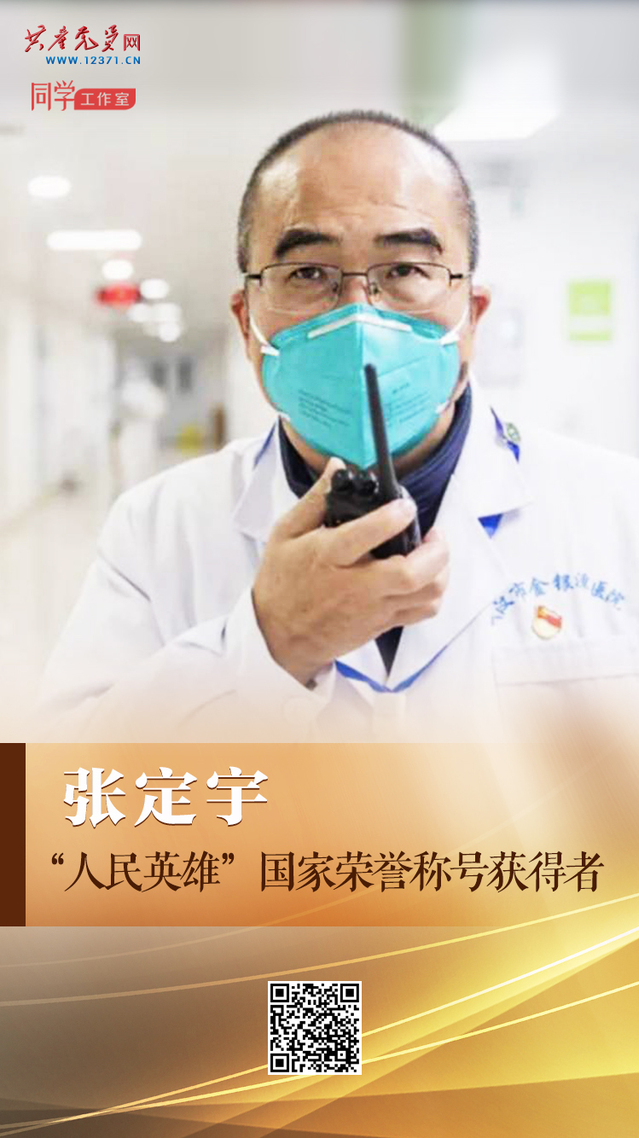 张定宇,男,汉族,中共党员,1963年12月生,河南确山人,湖北省卫生健康委员会副主任、武汉市金银潭医院经理。他长期在医疗一线工作,曾带队赴汶川抗震救灾,多次参加国际医疗援助。2019年12月29日,在收治首批7名不明原因肺炎患者后,他立即组建隔离病区,率先采集样本开展病毒检测,组织动员遗体捐献,为确认新冠病毒赢得了时间,为开展新冠肺炎病理研究创造了条件。作为渐冻症患者,他冲锋在前,身先士卒,带领金银潭医院干部职工共救治2800余名新冠肺炎患者,为打赢湖北保卫战、武汉保卫战作出重大贡献。荣获“全国卫生健康系统新冠肺炎疫情防控工作先进个人”称号。