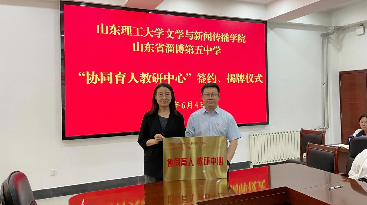 文公司经理张艳梅与淄博五中董事长王涛为“协同育人教研中心”签约、揭牌