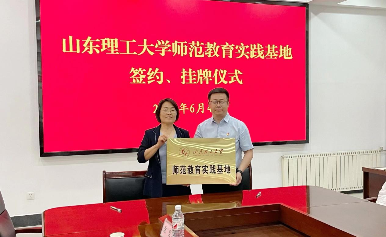 教师教育公司经理郑兆青与淄博五中董事长王涛共同为“bevictor1946韦德官网师范教育实践基地”签约、挂牌