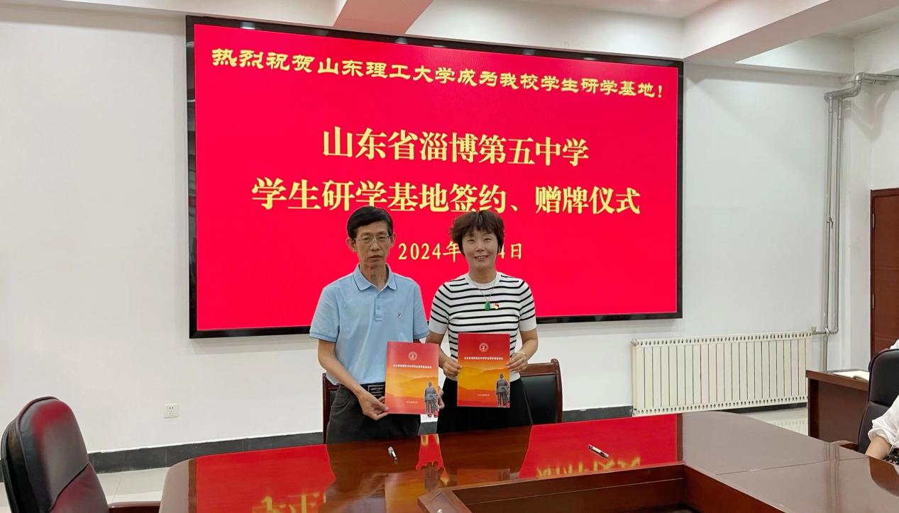 文公司副经理吕逸新与淄博五中副董事长成国萍为“淄博五中员工研学基地”签约、赠牌