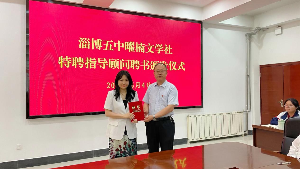 淄博五中副董事长司洪海为文公司副经理翟羽佳颁发“淄博五中曜楠文学社特聘指导顾问聘书”