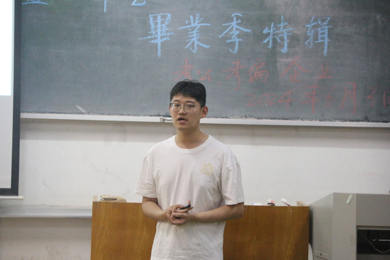 在考公考编企业就业专场中,中教2001班刘宇豪、中教2004班曹瑞琦、中教2002班路畅担任主讲人。刘宇豪从准备工作、简历制作、个人经验总结等三个方面分享就业经验,提醒同学们树立正确就业观,提前夯实就业基础。曹瑞琦介绍考编相关内容,她主要讲解了考前工作准备和笔试注意事项,希望同学坚持目标导向,保持良好心态,做好时间管理。路畅介绍考公相关内容,她指出备考要从笔试与面试两方面准备,把考公当作持久战,不应急于求成,要保持良好的心态。