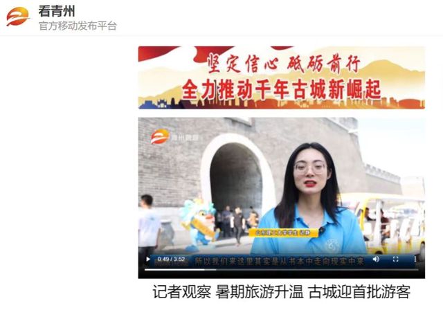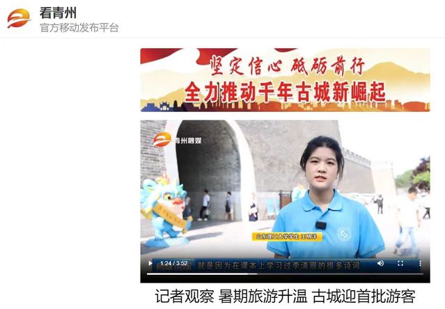 在青州古城主景区,大量衙署建筑遗存、西洋建筑群、古街牌坊、青砖青瓦的明清古街道及传统民居应接不暇,蔚为大观,蕴藉着深厚的历史感,散发着浓厚的文化气息。研究生迟静、王明洋接受了青州电视台的采访,分享了此次赴青州进行社会实践的感悟和收获。迟静认为,此次社会实践使自身充分感受到了传统文化的魅力,同时文学艺术与民间传统艺术也在此处碰撞并得到升华。王明洋认为,此次社会实践可以看作“行走的课堂”,真正实现了踏石留印、知行合一,使自身在实践中对所学专业知识有了更加深刻的感悟。