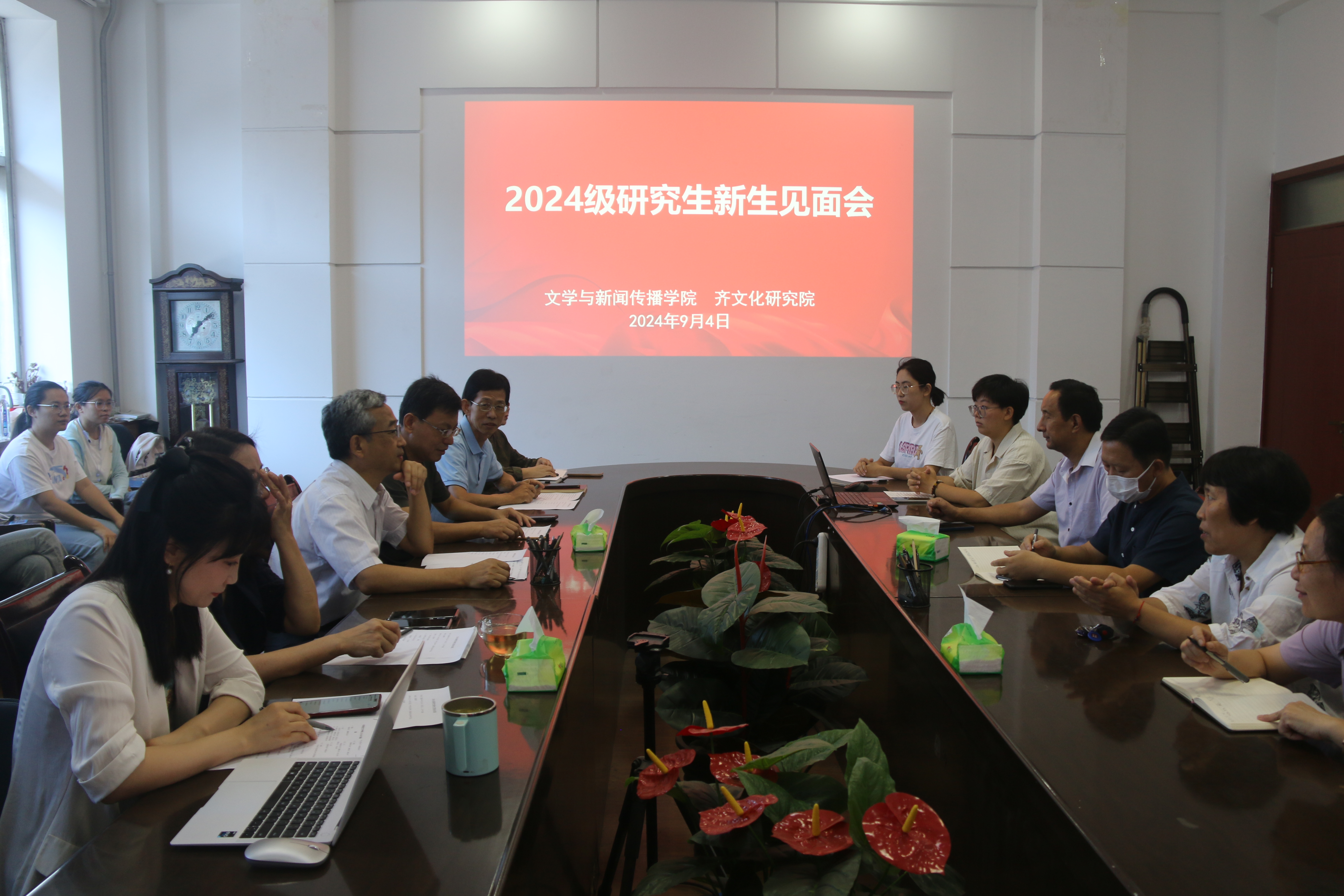 为欢迎2024级研究生新生,正确引导同学们树立奋斗目标,明确发展方向,做好研究生阶段的学习、科研和生活规划,9月4日上午,公司于2号教学楼219会议室召开2024级研究生新生见面会。文学与新闻传播公司党委书记李义勇、经理张艳梅、副经理吕逸新、翟羽佳,齐文化研究院经理巩曰国,出席新生见面会。研究生导师代表及2024级研究生新生参加会议。见面会由吕逸新主持。