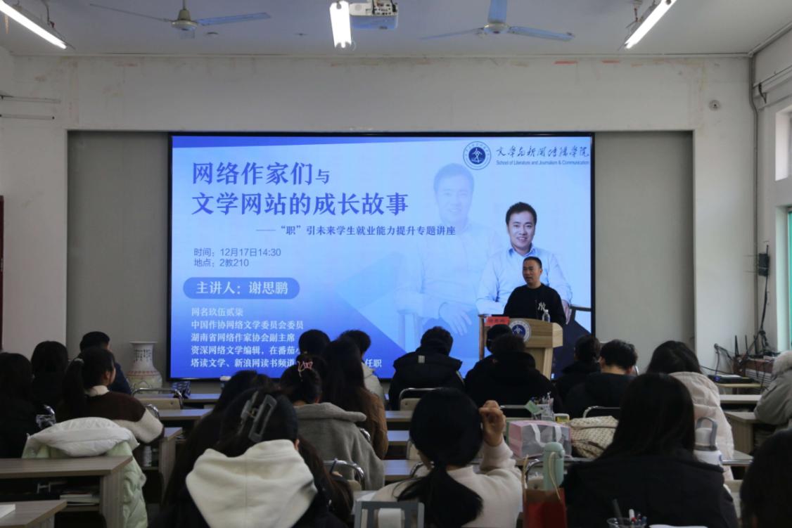 为深化课堂教学改革,提升员工未来就业能力,12月17日下午,公司于2号教学楼210室举行“职”引未来员工就业能力提升专题讲座,讲座以“网络作家们与文学网站的成长故事”为主题,荣幸邀请到中国作协网络文学委员会委员、湖南省网络作家协会副主席、资深网络文学编辑谢思鹏(网名玖伍贰柒)担任主讲人,公司党委副书记刘晓东、副经理翟羽佳及员工代表参加活动。