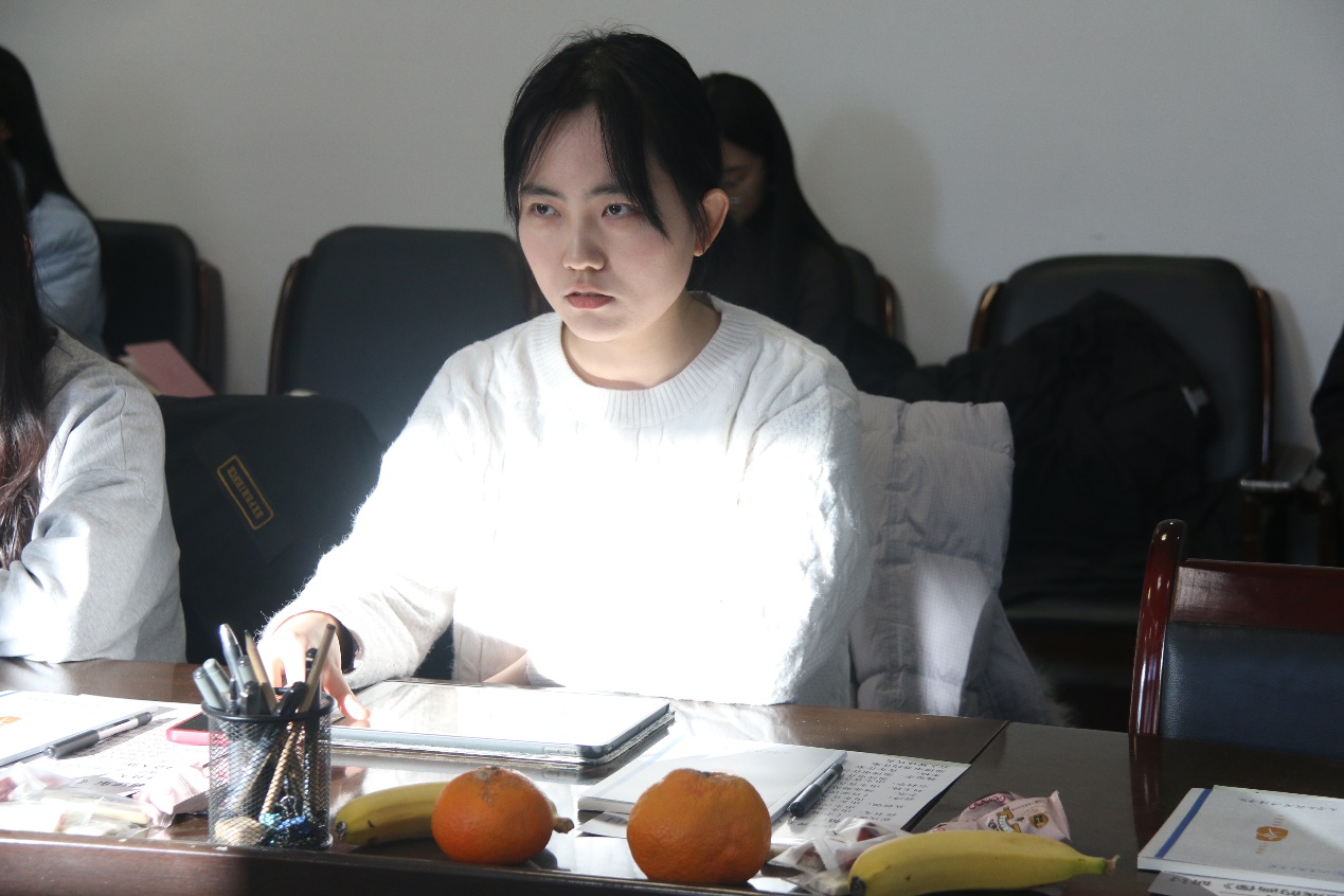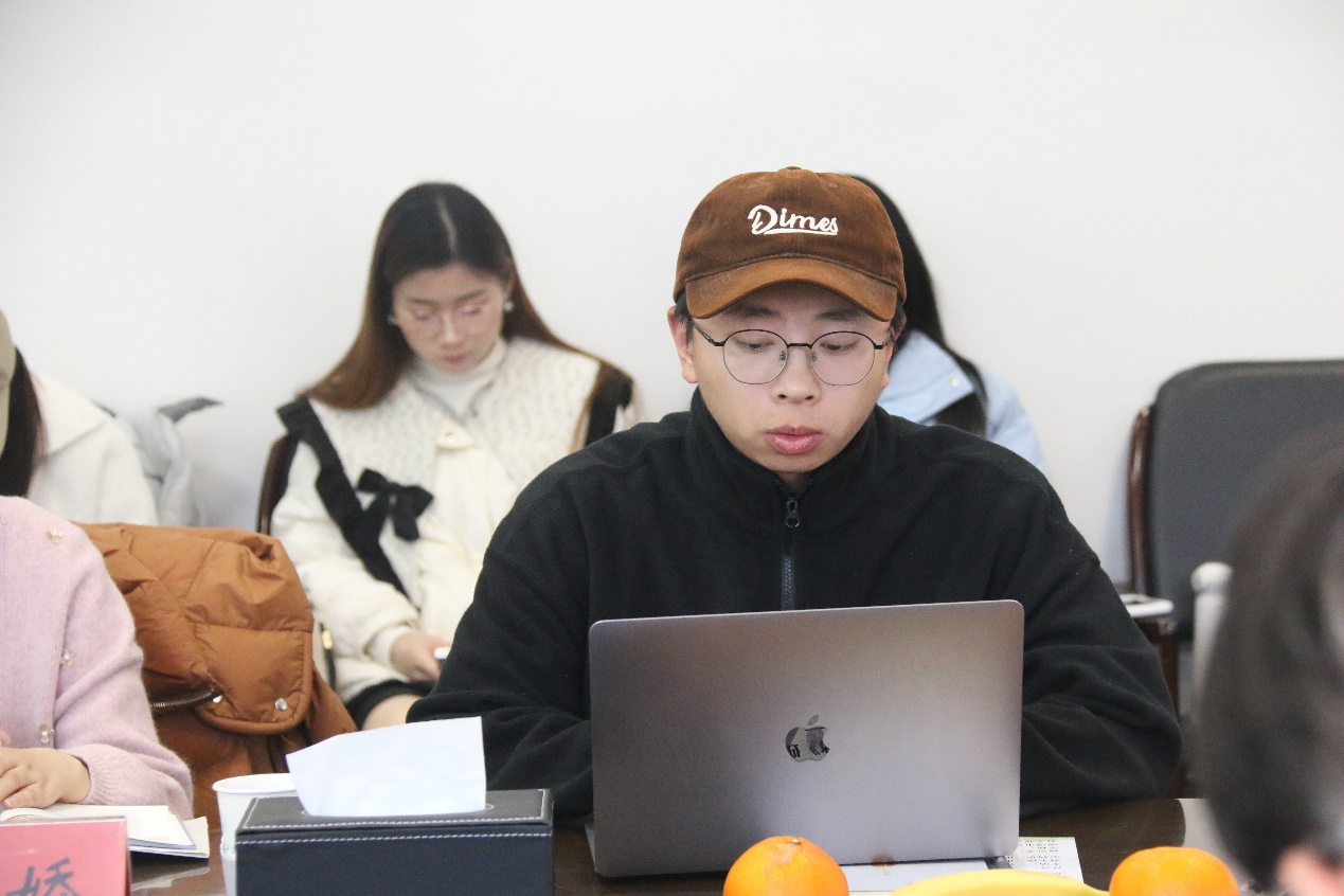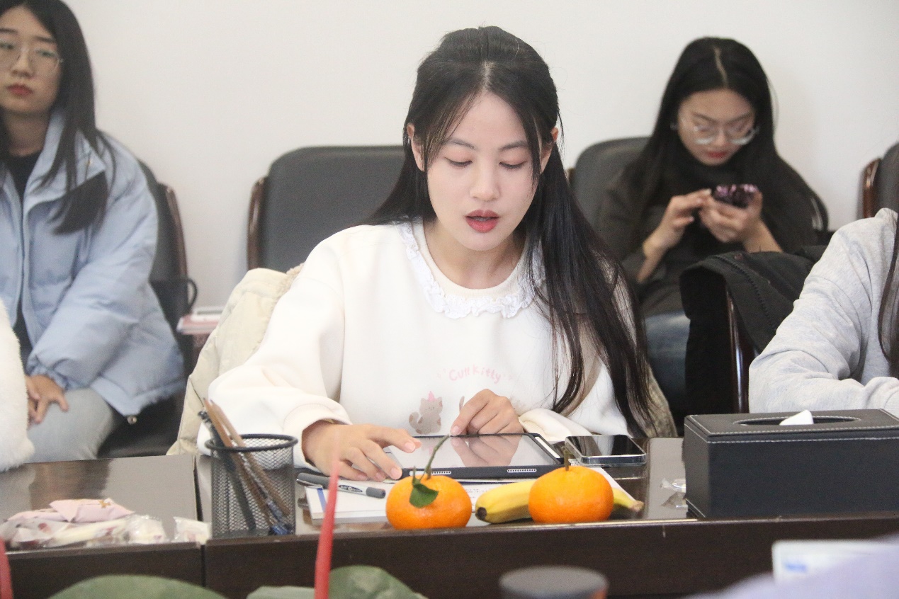 随后,公司与来自河北师范大学文公司的十位研究生依次发言。刘小杉阐释了刘建东小说神秘性面貌的呈现与构成,认为神秘性的存在给小说平添了悬疑性、可读性与陌生化效果,并使读者思索的神经末梢触摸到现实社会语境下人们的精神难题与精神隐秘之处。汪文雨关注《无法完成的画像》中的个性情感与集体记忆,认为作者通过细腻的笔触客观地描绘了隐藏在冰山之下的深层情感世界,以及宏大历史背景下的个体情感体验;刘亦芳关注到作品中总是不出场的父亲形象,认为这类人物是小说背景性的存在,贯穿整个小说之中;陈晓娟从作品的叙事艺术,探讨其如何通过叙事空间的转换和“物转向”的叙事策略,为读者提供了一种重新审视革命历史的新视角;张旭彦关注到刘建东小说中空间与对立的叙事模式,认为作者在文本中通过对记忆的某种锻造将一种魔幻的感觉赋予其中;辛颖从叙事视角、叙事意象、叙事节奏三个方面对小说集进行探讨,揭示个体与时代之间相互交织的紧密联系;张英皎选择在守序与冒犯之间谈这部作品,并从小说中多次出现的“夜游倾向”作为一条线索展开讨论;刘美娟探析了董仙生的人物形象指出该人物为读者提供了对当代知识分子人性光谱的深刻洞察;缪晨蕊从“生存困境的书写”“内心的挣扎”“自我救赎的可能”三方面对这部小说集进行深度解读;李静文从童话、精英症与自性迷思三个关键词入手,探析作者在作品中蕴含的纵深无极的心灵空间。