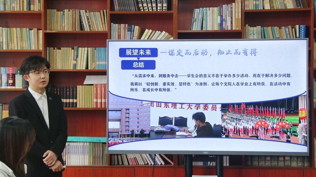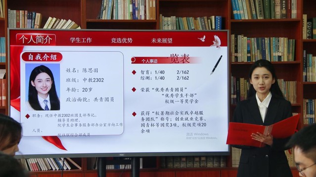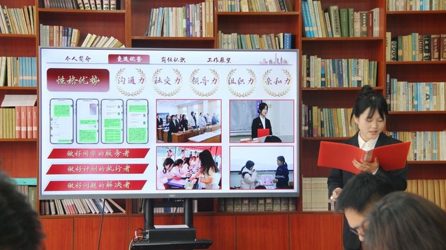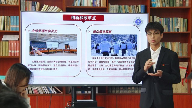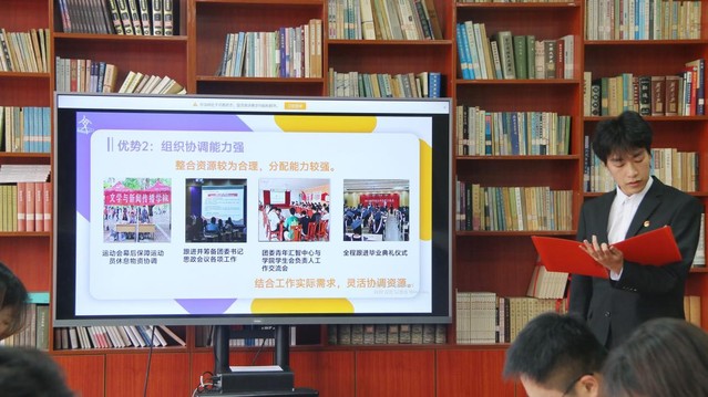 本次竞选严格遵循公平、公正、公开原则,候选人按抽签顺序依次进行展示答辩。通过PPT演讲,候选人围绕自我介绍、任职经历、个人优势、岗位认知及未来工作规划等方面展开陈述。在答辩环节,评委就竞选动机、工作优势、活动策划及应急处置能力等维度展开提问。竞选人应答思路清晰、逻辑严谨,评委通过针对性指导帮助候选人深化对岗位职责的认知,明确自身优势与发展方向。