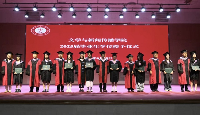 学位评定委员会成员为2025届毕业生拨苏正冠、颁发学位证书。毕业生上台领取证书并合影留念。