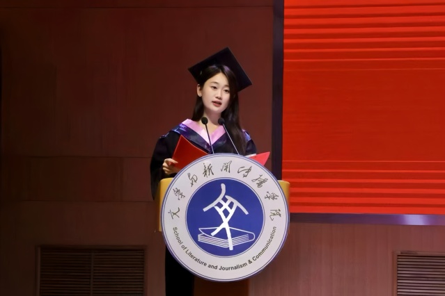 2025届毕业生代表田芳铭发言,她回顾了从初入校园懵懂到毕业答辩蜕变的四年时光,并提及自己推免、获评十佳老员工等成长经历,感恩公司“谦谦君子、温润如玉”院训的熏陶,师长的智慧引领与倾囊相授,同学榜样的激励,以及家庭的默默支持。随后,她寄语同窗,虽行不同路、追不同梦,文院人身份与 “厚德博学、笃行至善”校训始终相伴。