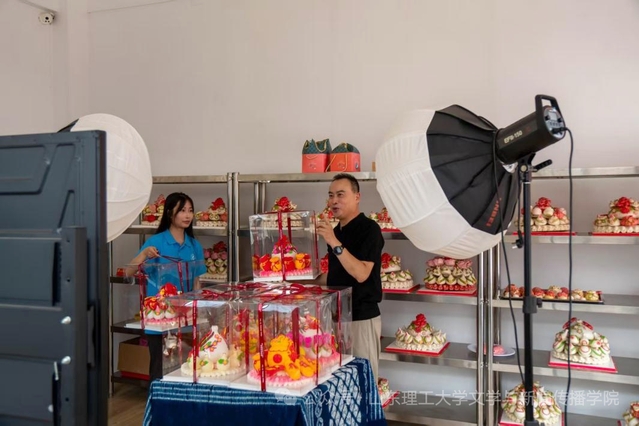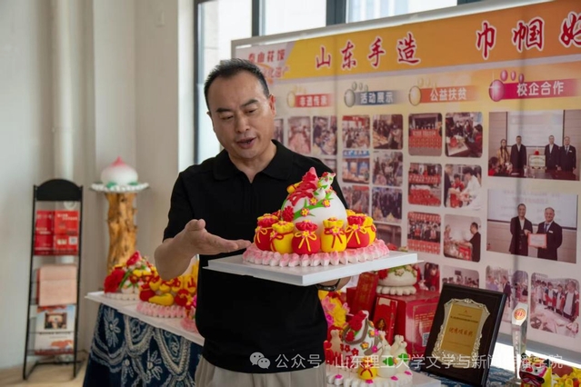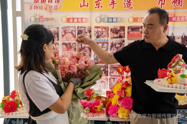 此外,王老师还带实践团成员参观了他的直播区,配备了环形的补光灯、多角度拍摄的手机支架,以及摆放着各式花馍样品的展示台。“现在光靠线下销售可不行,得让更多人隔着屏幕看见咱泰山花馍的好。”王老师笑着介绍,这些直播设备虽简单,却成了非遗“破圈”的重要帮手,让传统花馍走出本地,被更多人认识和喜爱。