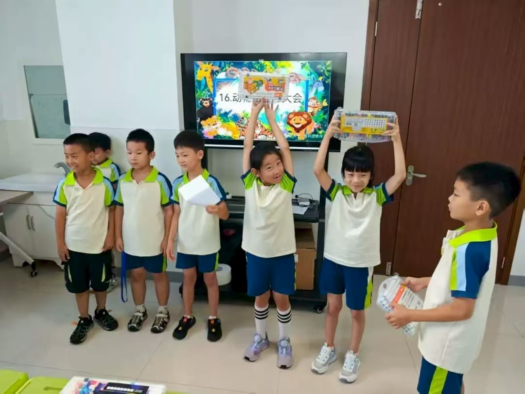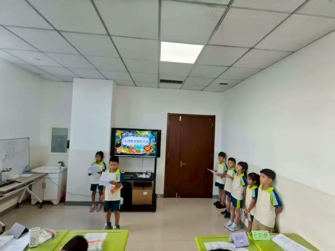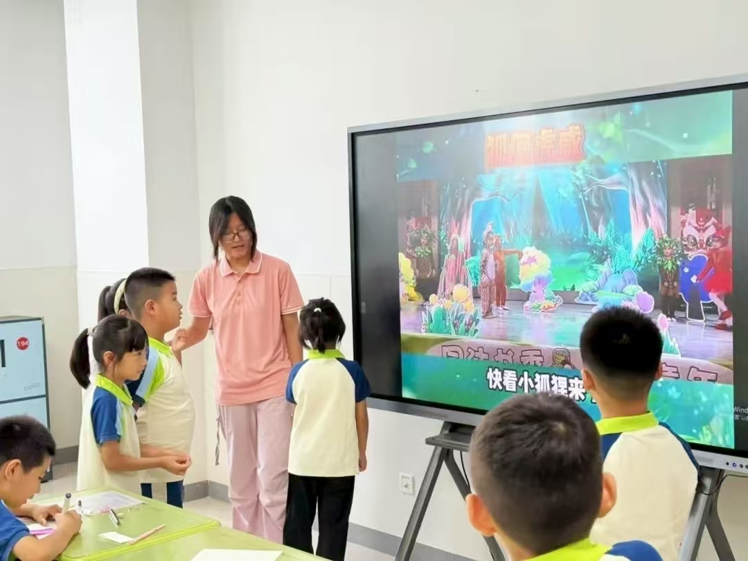 一年级二班的《动物王国开大会》同样精彩。实践团用生动的故事讲解引出剧情,梳理出“老虎让狗熊通知开大会——狗熊多次通知不完整——最终正确通知大家”的情节线。在角色分配时,让孩子们自主选择“老虎”“狗熊”“小白兔”“大灰狼”等角色,每个孩子都积极参与其中。实践团成员组织孩子分组讨论角色性格,“狗熊有点马虎,老虎很威严,小动物们很热心”,鼓励孩子模仿角色语气说话,带领他们学习剧中经典动作,比如狗熊挠头表示困惑的样子,老虎威严的神态等,大家在欢笑中理解着故事。