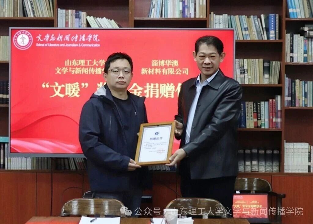 李涛代表公司与淄博华澳新材料有限公司签订“文暖”奖学金协议并颁发捐赠证书。