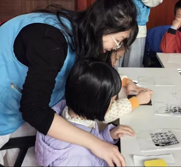 随后的“拓印”手工体验环节,志愿者为孩子们提供了刻有古诗词的拓印板,孩子们在志愿者的指导下,亲手制作出一张张独特的拓片。这亲手拓印的不仅是文字,更是对传统文化的一份直观触摸与深刻记忆。