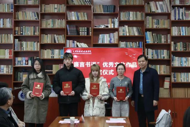 活动伊始,王涵宇介绍了“廉言书语”优秀文化作品征集活动的开展情况,李乐乐宣读了获奖名单。随后,与会嘉宾依次为获奖师生代表颁发荣誉证书并合影留念,活动现场气氛热烈。